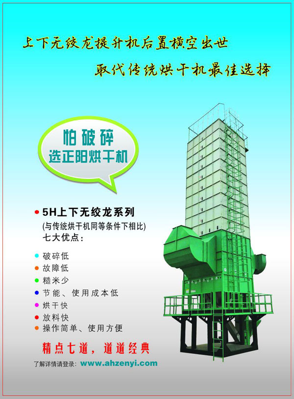 為了更好的滿足市場和客戶的需求,正陽科技推出一款“上下無絞龍系列”谷物烘干機。糧食破碎霉變猛于虎,正陽烘干機保護糧食安全保護人類健康。正陽烘干機上下無絞龍系列比傳統(tǒng)烘干機節(jié)能減耗,是中國糧食烘干機上下無絞龍?zhí)嵘龣C后置發(fā)明者與領航者。